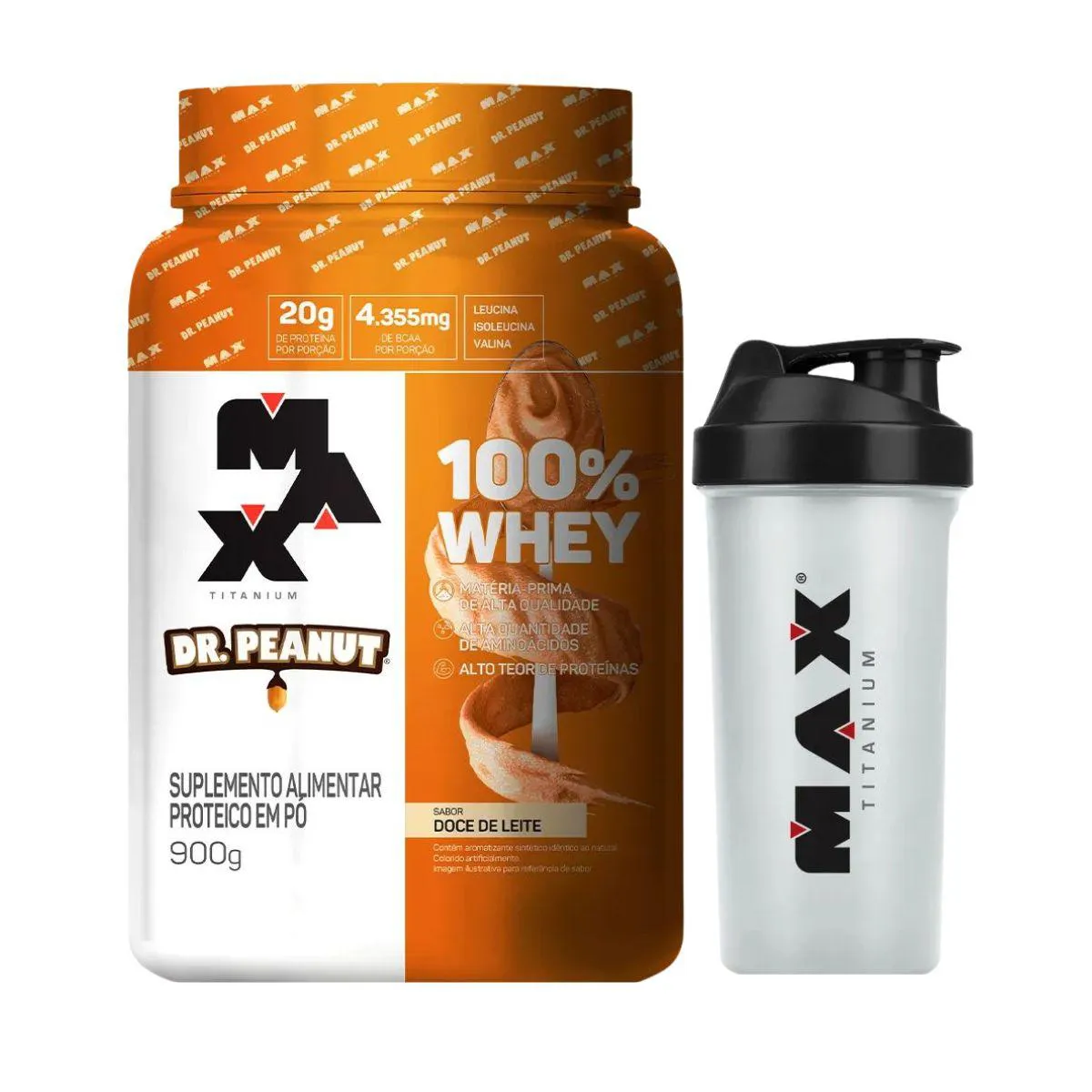 Whey Protein Dr Peanut 100% Doce de Leite Mix 900G + Coqueteleira 700Ml Max Titanium