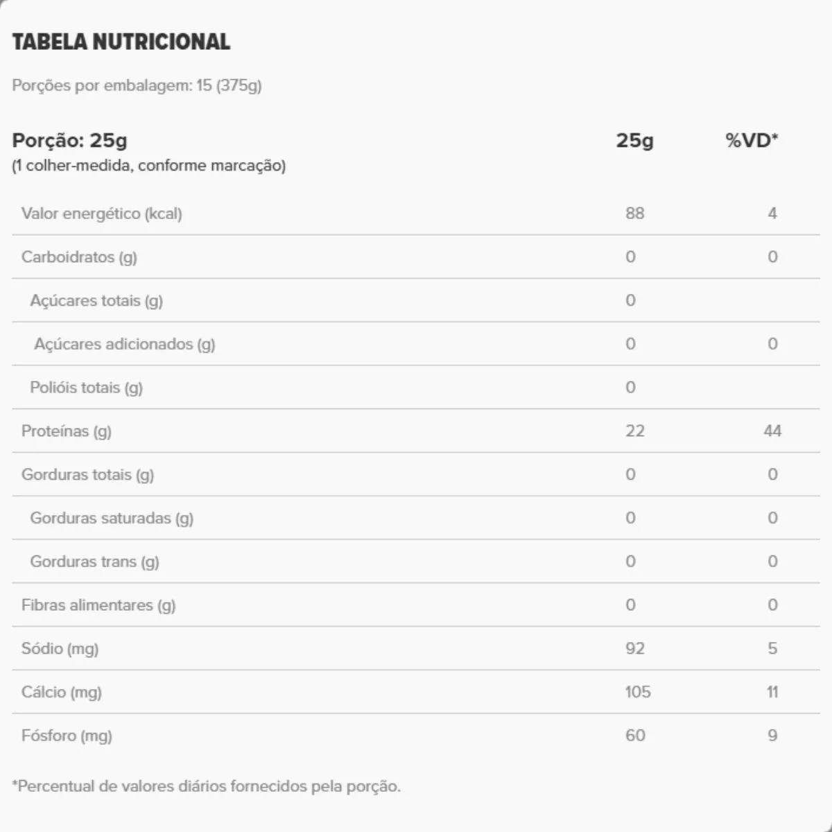 - Proteína pura sem aditivos, açúcar, glúten, lactose, corantes ou conservantes.