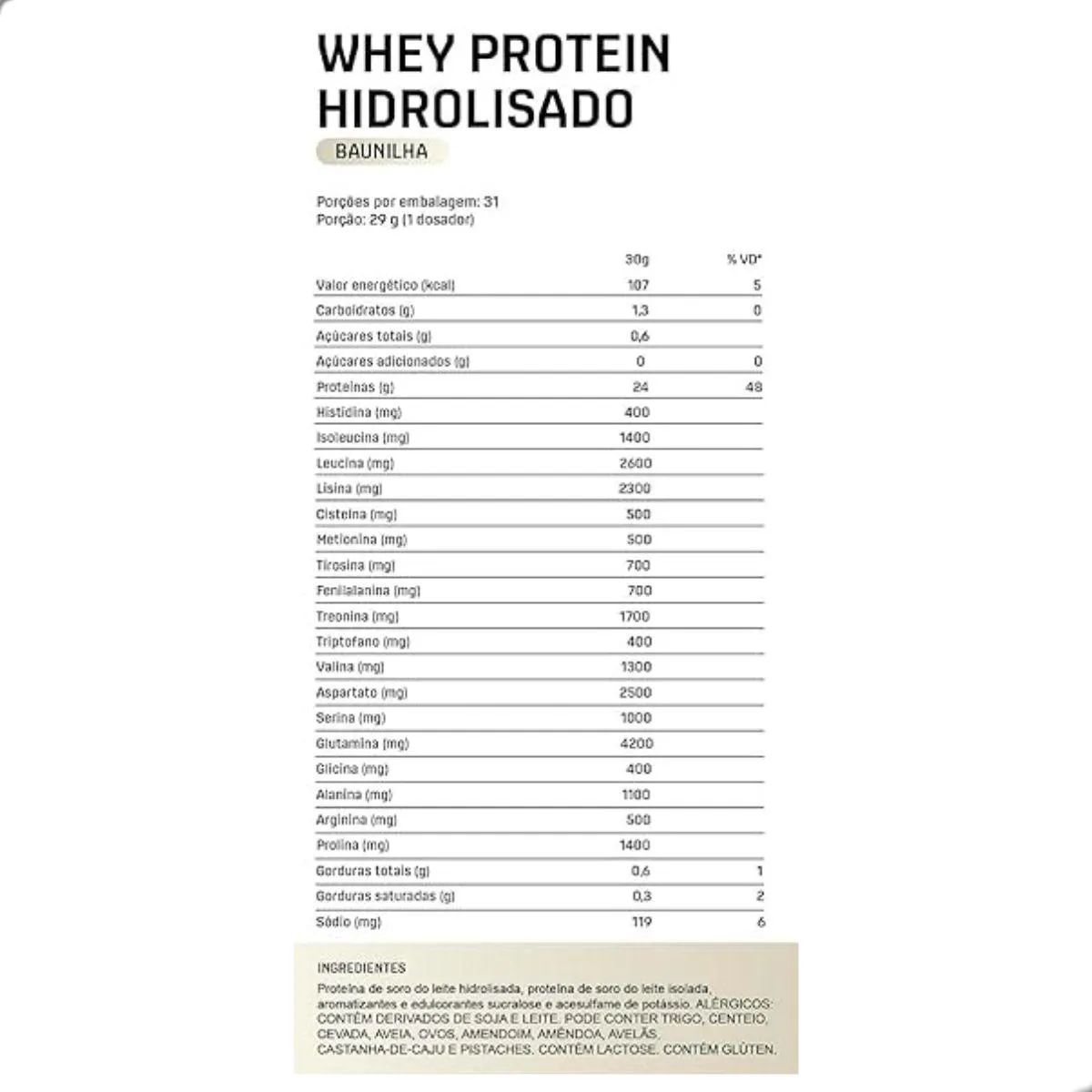 A apresentação em pote de 900 g rende aproximadamente 30 doses. A fórmula não possui glúten e é adoçada com edulcorantes de origem natural, proporcionando sabor suave sem adição de açúcar. É indicada para praticantes de musculação e esportes intensos que buscam rápida recuperação e suporte à síntese proteica.