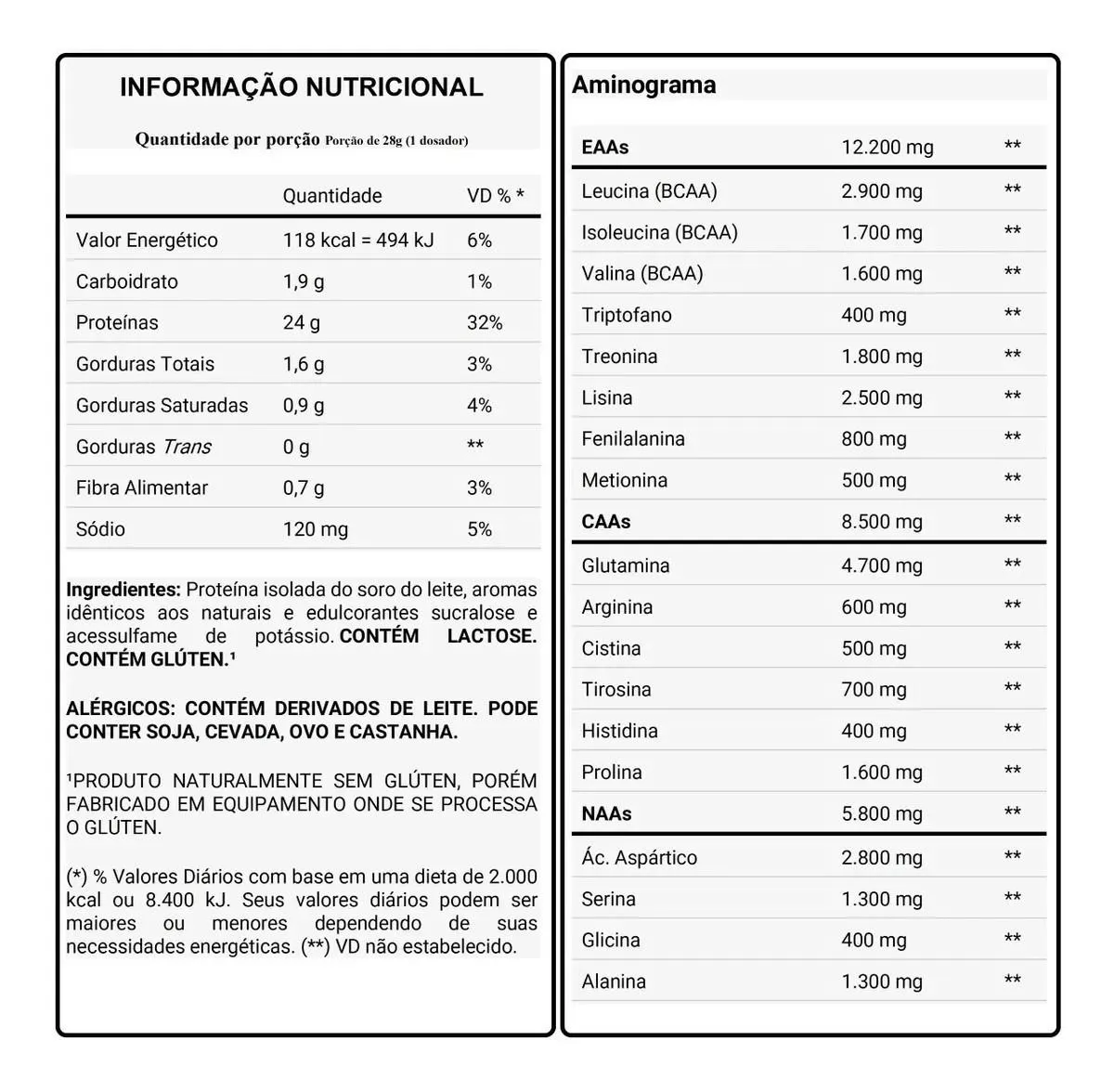 Sugestão de uso: Dilua uma medida de Whey Protein Isolado em 250 - 350ml de água. Ideal para ser consumido pré/pós treino, ao acordar, entre as refeições ou conforme orientação do seu nutricionista e/ou médico."