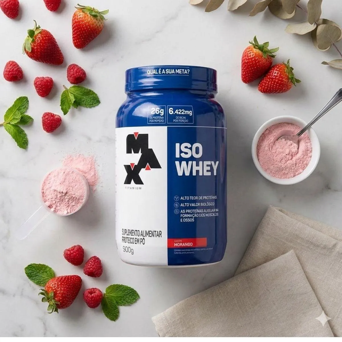 bem estar em um suplemento premium. Pode ser consumido misturando uma porção em água gelada, leite desnatado ou bebida de preferência, com auxílio de coqueteleira ou liquidificador. Fácil de preparar e consumir no dia a dia, adapta se bem ao café da manhã, pós treino ou lanches intermediários, conforme a rotina individual. Embalagem de 900g, suplemento em pó, whey protein isolado, sabor morango, com aproximadamente 26g de proteína por porção. Produto não contém glúten e apresenta ótima diluição, sendo indicado para maiores de 19 anos. Aproveite as últimas unidades e garanta agora o Whey Protein Isolado Morango Max Titanium com excelente custo benefício e padrão elevado de qualidade.