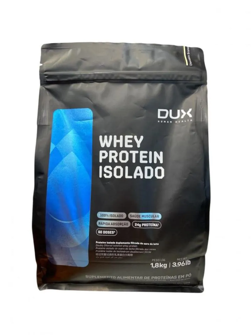 whey protein ISOLADO (1,8Kg) - DUX NUTRITION  O Whey Protein Isolado Dux Nutrition possui baixo teor de gorduras e carboidratos, sendo ideal para construção e recuperação muscular sem perda de definição, como um snack fit prático ou sem culpa em suas receitas. Uma proteína 100% pura, duplamente filtrada, sem adição de outro tipo de Whey ou de proteínas inferiores.   Se há um nutriente indispensável, é a proteína. Ela é feita de aminoácidos, que são os blocos de construção do nosso corpo. A proteína do soro do leite, em inglês “Whey Protein”, é uma das fontes de aminoácidos de melhor absorção, maior até que o frango ou peixe. Isso torna o Whey uma forma conveniente de ingerir proteína, melhorando a saúde, o bem-estar e os resultados dos treinos.   BENEFÍCIOS: * Matéria-prima premium importada, obtida através do processo de extração de microfiltragem, sem renunciar do sabor real das nossas proteínas;* Aporte completo de aminoácidos: 6,2g de BCAAs; 4,7g de glutamina e 2,9g de leucina, por dose;* 24g de proteína;* Disponível em versões sem adoçantes artificiais, 100% naturais;* O nome diz tudo: Whey Protein Isolado 100% puro, com transparência total, do nome do produto à lista de ingredientes;* Não contém goma xantana, complexos vitamínicos à base de maltodextrina, espessantes, estabilizantes, conservantes ou qualquer outro ingrediente inferior;* Proteína moderna, desenvolvida por especialistas para atletas de esportes de performance (bodybuilding, crossfit e artes marciais), pessoas que buscam uma proteína com baixa caloria (para snacks fit e receitas sem culpa) e pessoas que buscam uma proteína ultrapura de altíssima qualidade;* Contém corantes 100% naturais, sem ingredientes artificiais.   Embalagem disponível: pote contendo suplemento na forma de pó. Sabores: Baunilha, chocolate, Coco e Morango. Peso Líquido: 1,8Kg