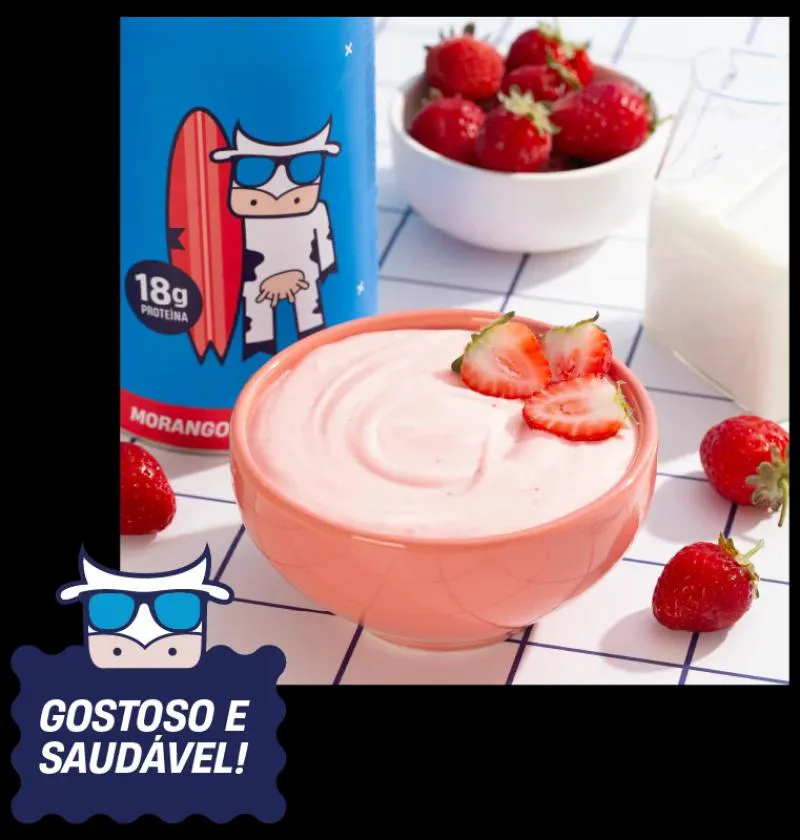 - Sabor de morango agradável e cremoso que torna o consumo mais prazeroso.