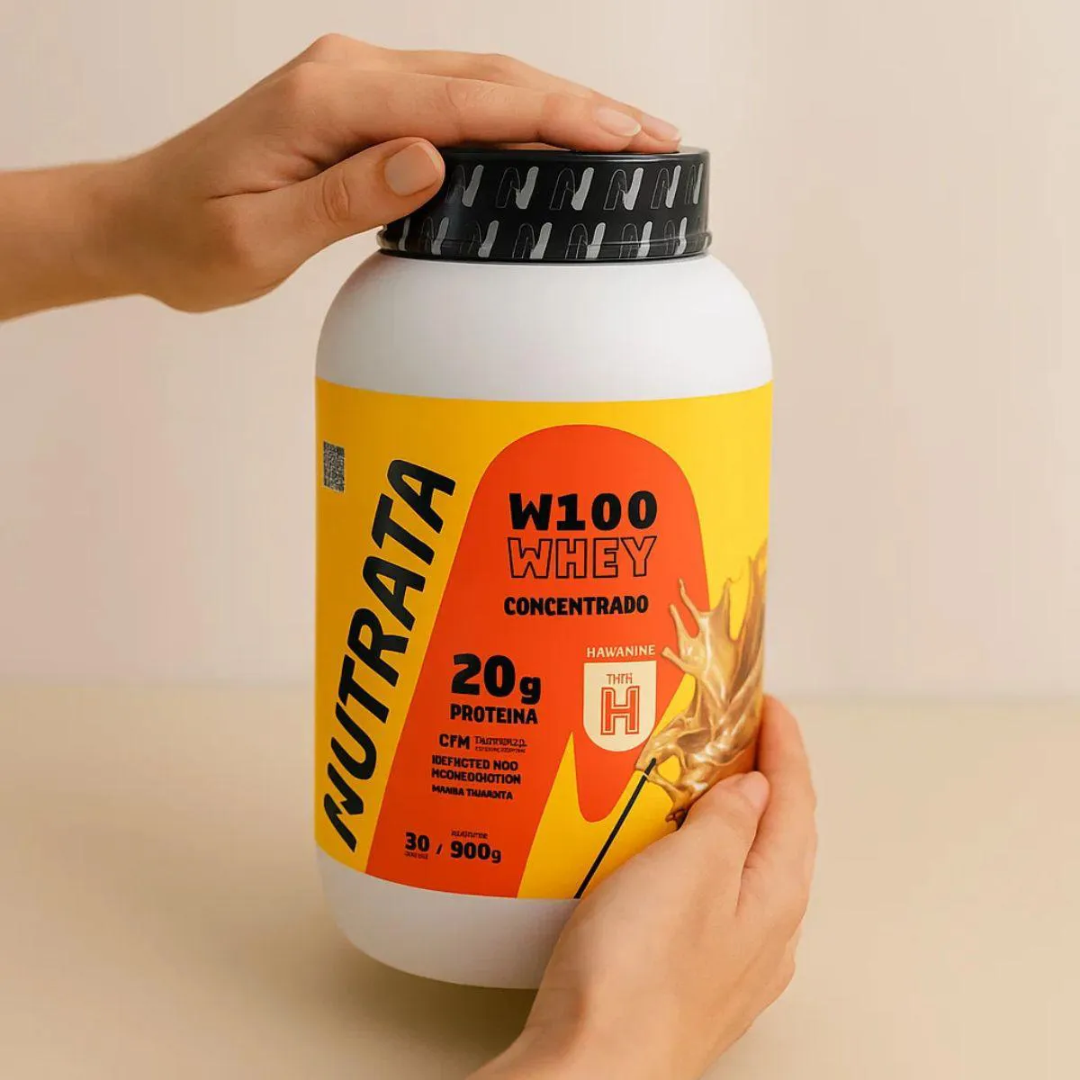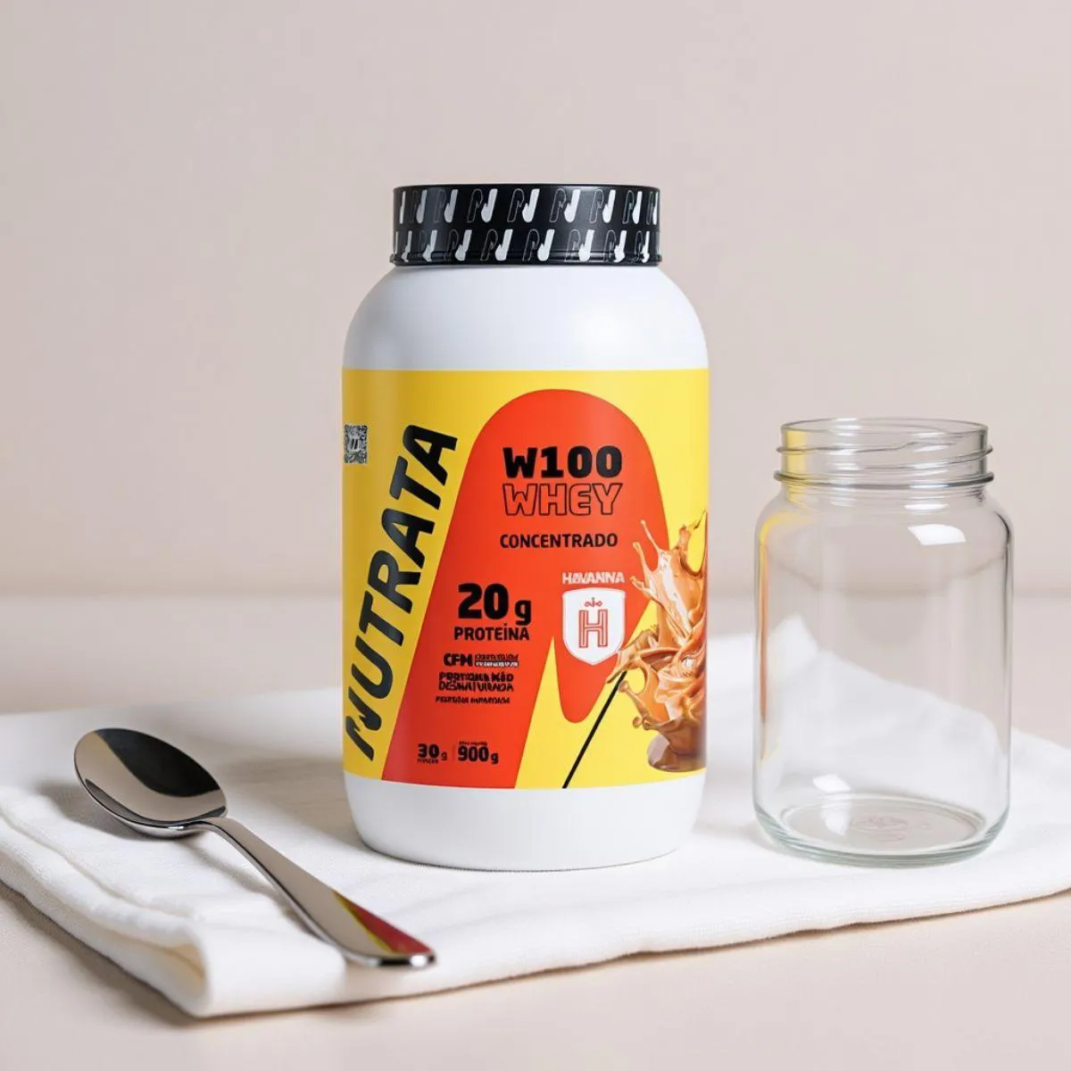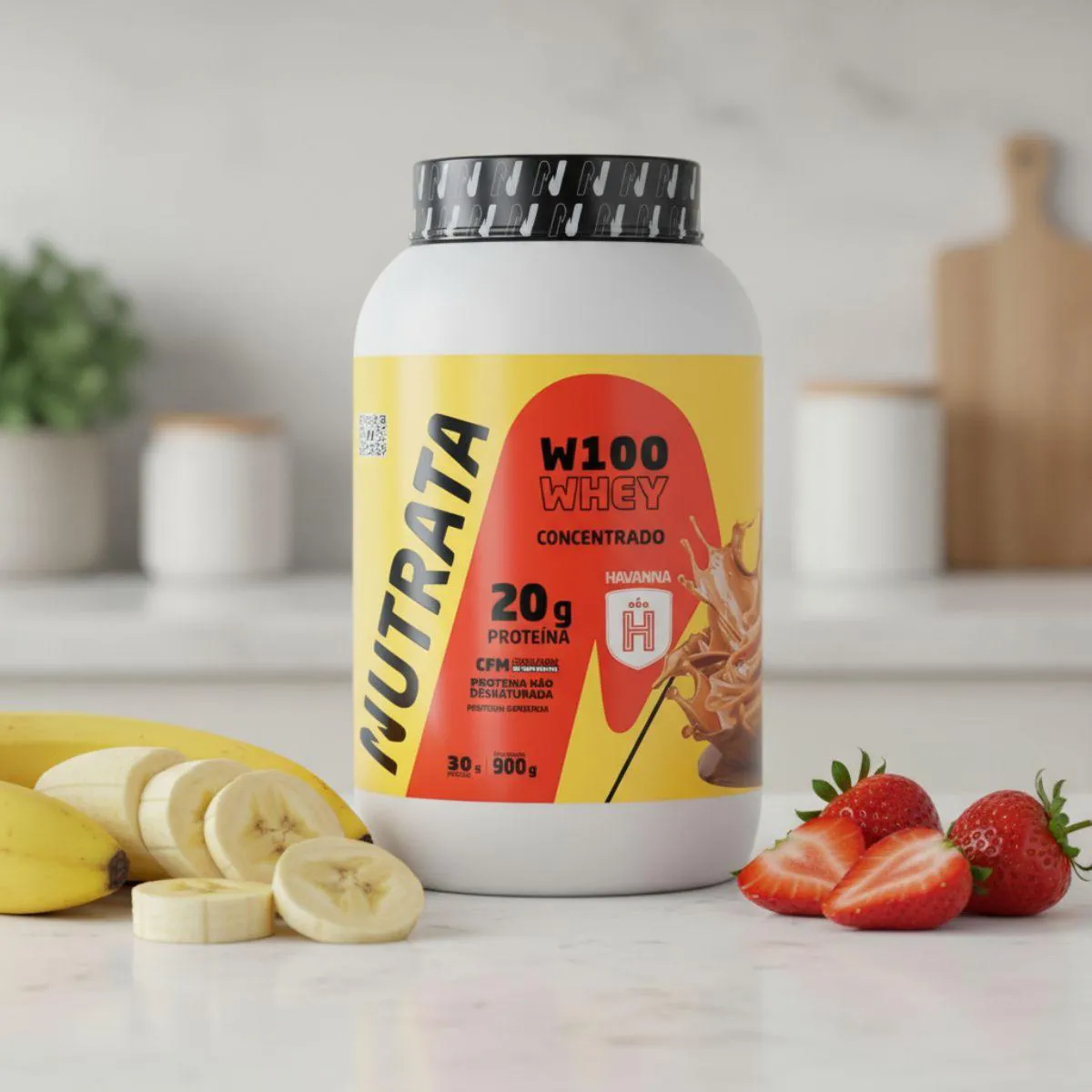 whey protein W100 Concentrado Havanna Pote 900g Nutrata whey protein W100 concentrado com sabor Havanna, pote de 900 g.