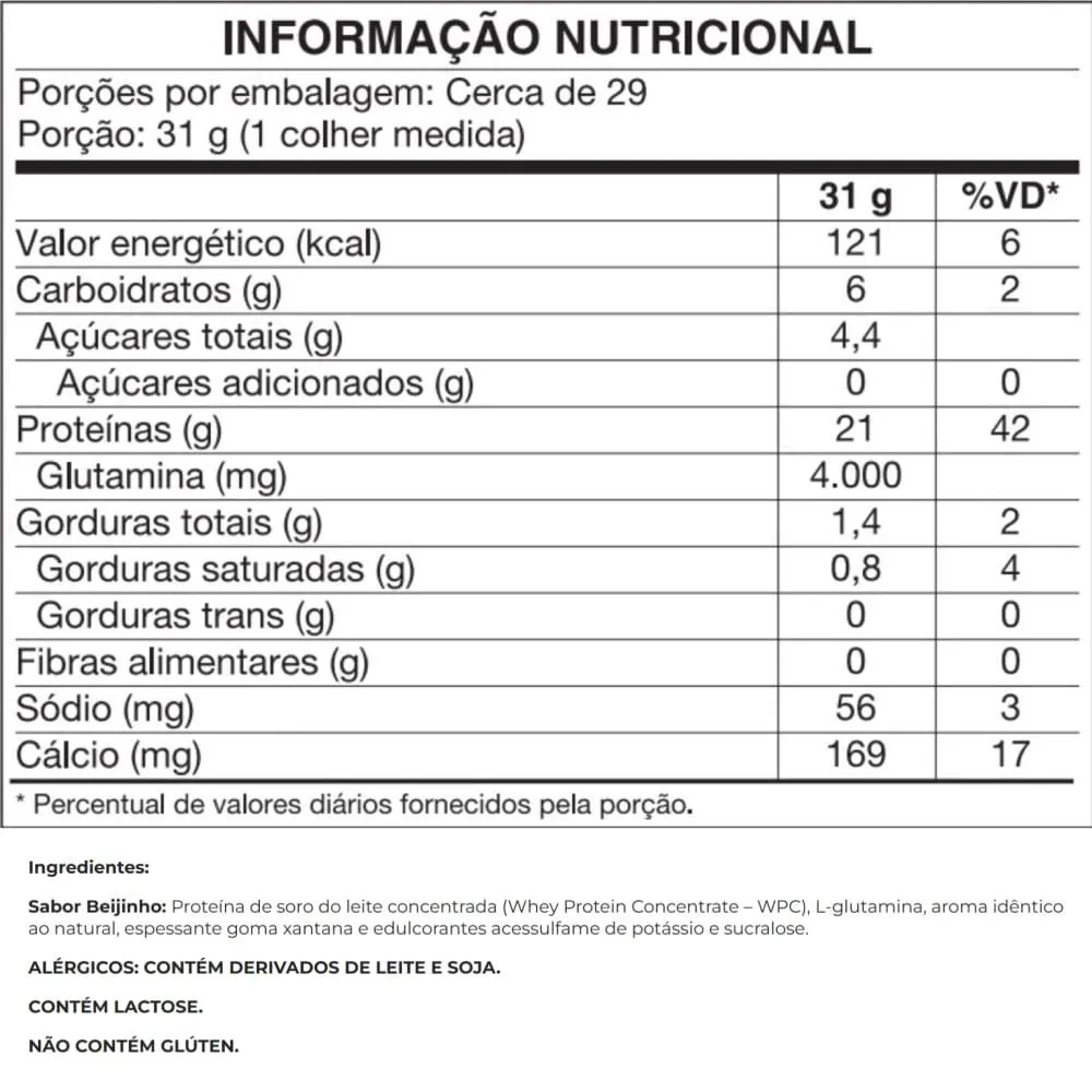 O Whey Protein WPC é um suplemento alimentar proteico formulado com whey protein concentrado e L-glutamina, produzido com proteína de alto valor biológico para complementar a alimentação diária. Cada porção do produto oferece 21g de proteínas e 4g de glutamina, com um sabor suave de beijinho.