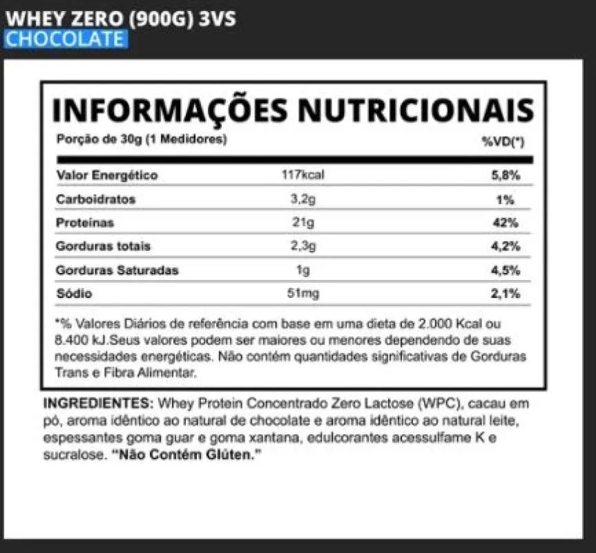 Whey Zero Lactose (900g) - 3VS Nutrition Whey Zero Lactose da 3VS é um suplemento formulado com a proteína de soro do leite. whey protein zero lactose passa por um processo de quebra da lactose em glicose e galactose que são açúcares que não causam intolerância. Tem alto valor biológico e possui baixas quantidades de gorduras e carboidratos além de fornecer todos os aminoácidos necessários para o organismo, inclusive os BCAAs e glutamina. É uma proteína de fácil digestibilidade e ótima absorção. Benefícios: * Melhora da retenção de nitrogênio, melhorando o crescimento dos músculos;* Não causa os sintomas digestivos, para quem é intolerante a lactose;* Melhora o sistema imunológico;* Tem ação antioxidante;* Possui rápida absorção dos nutrientes pelo corpo;* Auxilia no controle da glicose;* Pessoas que tem asma podem ter a melhora dos sintomas com o uso do suplemento;* As proteínas presentes, melhoram a formação dos músculos e ossos.