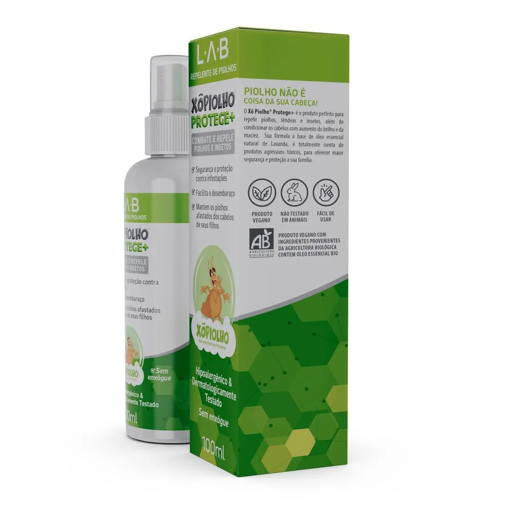 Formula VeganaXô Piolho® Protege é um repelente especialmente desenvolvido para manter os piolhos afastados dos cabelos das crianças.Formulado com um ativo repelente de alta tecnologia, amplamente utilizado na Europa e nos Estados Unidos, o produto é inodoro e livre de qualquer substância tóxica.Seguro e eficaz, pode ser utilizado por crianças a partir de 2 anos de idade, além de gestantes, pais e professores, proporcionando proteção prática e tranqüila para toda a família.O Xô Piolho® Protege+ é o produto perfeito para repelir piolhos, lêndeas e insetos, além de condicionar os cabelos com aumento do brilho e da maciez. Sua formula a base de óleo essencial natural de Lavanda, é totalmente isenta de produtos agressivos tóxicos, para oferecer maior segurança e proteção à sua família. Quais são os benefícios: Xô Piolho® Protege é indicado para os cabelos de todas crianças. E pode ser usado diariamente. Sua formulação é enriquecida com puro Óleo Essencial de lavanda, que contribui na repelência dos piolhos. Possui ação instantânea. Previne infestações de piolhos. Protege toda a família. Não possui nenhuma contra-indicação Facilita o desembaraço, aumenta o brilho e melhora a maciez dos cabelos Xô Piolho® Protege é dermatologicamente e clinicamente testado. Produto Hipoalergenico. O ativo repelente deste produto é usado há mais de 40 anos na Europa e EUA É inodoro e não causa alergias É isento de quaisquer toxicidades para mamíferos, incluindo bebês, crianças e gestantes Suave para o meio ambiente (ação biodegradável) Possui amplo espectro de eficácia e uma proteção duradoura Excelentes propriedades cosméticas, auxiliando no desembaraço dos cabelos Fácil de usar. Pode ser aplicado sobre cabelos secos ou molhados. Por todos esses motivos, é o repelente preferido especialmente para uso infantilAlem disto: