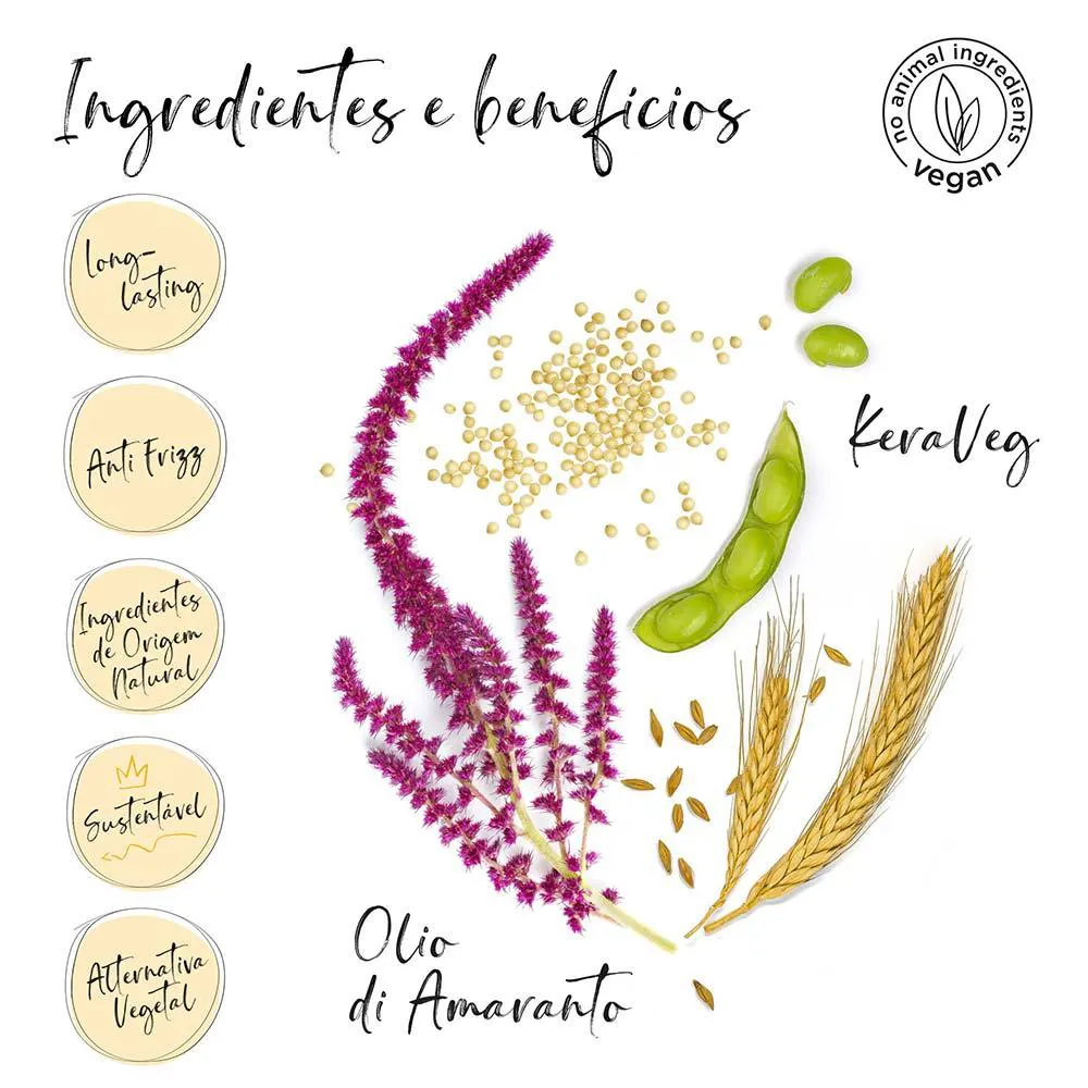 Além de óleo de amaranto, particularmente rico em emolientes, proteínas, sais minerais e vitamina e, este óleo, além de nutrir o cabelo em profundidade, envolve-o em uma fina, mas forte barreira que dificulta a penetração da umidade no interior, protegendo-o por muito tempo.