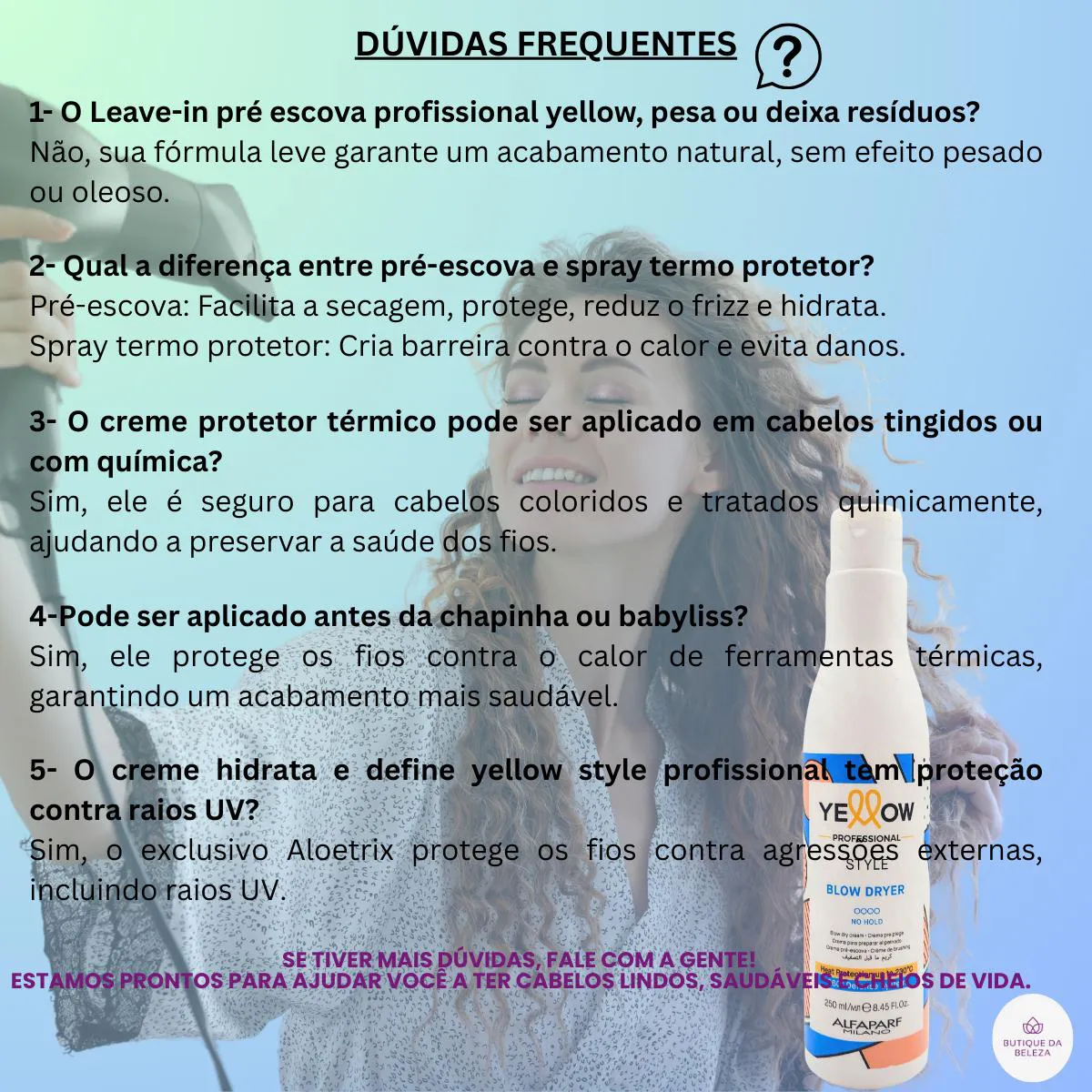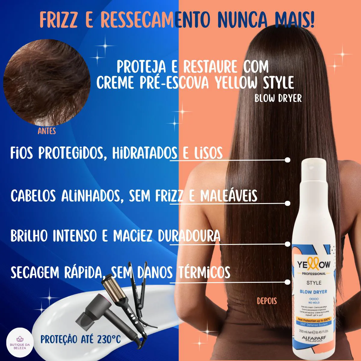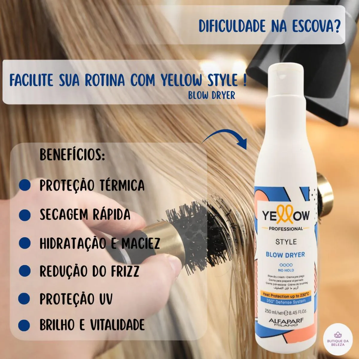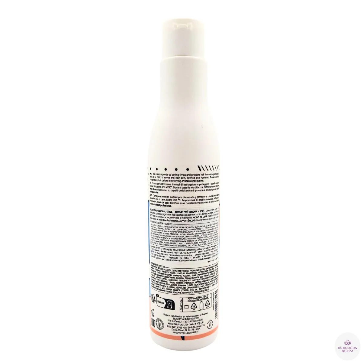 SERVIR E AJUDAR SÃO NOSSOS DEVERES CREME PRÉ-ESCOVA BLOW DRYER STYLE YELLOW PROFESSIONAL Escova Perfeita SEM Danos: Proteção Térmica + Hidratação em 1 Passo! Seus fios sofrem com frizz, ressecamento e danos térmicos? O Creme Pré-Escova Blow Dryer Style Yellow oferece a blindagem ideal para uma escovação segura, garantindo uma secagem mais rápida, hidratação intensa e proteção contra danos causados pelo calor. Agora você pode conquistar um cabelo sedoso, protegido e com movimento natural sem preocupações. Com o 360° Defense System, ele protege contra agressões externas, enquanto o Café Verde e o Aloetrix restauram a vitalidade e oferecem brilho intenso. Garanta já seu Pré-Escova Yellow e transforme sua rotina capilar! INDICADO PARA QUAL tipo de cabelo Cabelos Lisos Cabelos Ondulados Cabelos Crespos Cabelos Cacheados Cabelos Quimicamente Tratados Todos os Tipos de Cabelo BENEFÍCIOS Proteção 360º: Sistema inovador que protege contra estresse térmico e oxidativo, com resistência ao calor de até 230ºC. Secagem mais Rápida: Reduz o tempo de exposição ao calor, preservando a saúde dos fios. Hidratação Intensa: Mantém os cabelos macios e sedosos, evitando o ressecamento. Facilidade de Penteado: Ele facilita a escovação e modelagem dos cabelos, tornando o processo mais rápido e eficiente. Redução do Frizz: Controla os fios arrepiados, proporcionando um acabamento mais alinhado. Brilho e Vitalidade: Ingredientes como Café Verde, Sementes de Rambutan e Chia restauram a saúde capilar. Proteção contra Raios UV: O exclusivo Aloetrix protege os fios contra agressões externas. RESULTADOS Fios Protegidos, hidratados e incrivelmente lisos após a escova Fios mais Resistentes, sem quebra ou pontas duplas Fios alinhados e sem frizz, garantindo um acabamento impecável Brilho intenso e maciez prolongada, mesmo em dias úmidos Secagem visivelmente mais rápida, diminuindo os danos causados pelo calor MODO DE USO 1- Lave e condicione os cabelos como de costume 2- Retire o excesso de água, deixando os fios úmidos 3- Distribua uniformemente pelos fios, do comprimento às pontas evitando a raiz 4- Finalize com o secador, chapinha ou difusor, modelando conforme desejado DICA DA BUTIQUE DA BELEZA Para potencializar os resultados, após a escova, finalize com um Óleo Yellow Nutritive nas pontas para selar a cutícula e prolongar o brilho. DÚVIDAS FREQUENTES O Leave-in pré escova profissional yellow, pesa ou deixa resíduos? Não, sua fórmula leve garante um acabamento natural, sem efeito pesado ou oleoso. Qual a diferença entre pré-escova e spray termo protetor? Pré-escova: Facilita a secagem, protege, reduz o frizz e hidrata. Spray termo protetor: Cria barreira contra o calor e evita danos. O creme protetor térmico pode ser aplicado em cabelos tingidos ou com química? Sim, ele é seguro para cabelos coloridos e tratados quimicamente, ajudando a preservar a saúde dos fios.