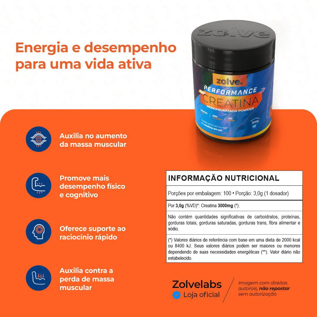 Zolve Performance Creatina é um suplemento em pó de creatina monohidratada pura, sem aditivos, indicado para atletas e praticantes de atividades físicas que buscam otimizar a performance em exercícios de alta intensidade e curta duração. A creatina atua como reserva rápida de energia para o músculo, permitindo maior força, potência e melhor recuperação entre os treinos.